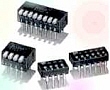 【ディップ・スイッチ 】 スライド・スイッチのディジタル版。状態設定用としてデータ・バスにつなげることが多いため多くの接点が必要とされ、2〜8極といった連段式として端子ピッチをDIPタイプのICと同じにしたものです。ディップスイッチはスライド式のほか、接点構造がトグルと同じピアノ型、プッシュ型、シーソ型があり、小型化の要求からSIP(シングラインパッケージ)にしたものも市販されています。更に、ディジタル回路に使う場合は、スイッチ状態入力回路ではプルアップして使われるのでプルアップ抵抗内蔵型や、ダイナミッ.ク・スキャン用のダイオード内臓型も市販されています。