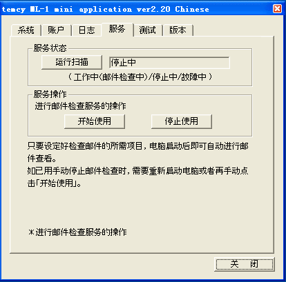 只要您完成以上三项「(2)系统信息的设置」,「(3)账户信息的设置」,「(5)服务(开始使用/停止使用)」的注册,即可开始邮件检查。 一经注册,联机后temcyML-1mini即会自动成为驻留软件开始工作(下图红线部分)。 右击红线部分可结束其运行。 如果希望再次运行时,必须要重新启动电脑,再单击「(5)服务(开始使用/停止使用)」的「开始使用」。